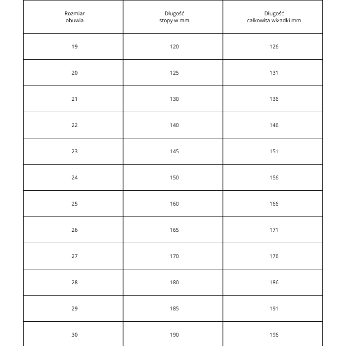 – Rozmiary: 19-24, dostosowane do różnych grup wiekowych.