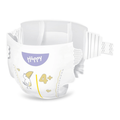 Pieluszki posiadają także wskaźnik wilgotności, który zmienia kolor z żółtego na niebieski, informując opiekuna o konieczności wymiany pieluszki, co zwiększa wygodę użytkowania. Pieluchy Happy nie zawierają chloru, lateksu, ftalanów, substancji zapachowych, ani innych szkodliwych składników, co czyni je bezpiecznym wyborem dla wrażliwej skóry niemowląt.